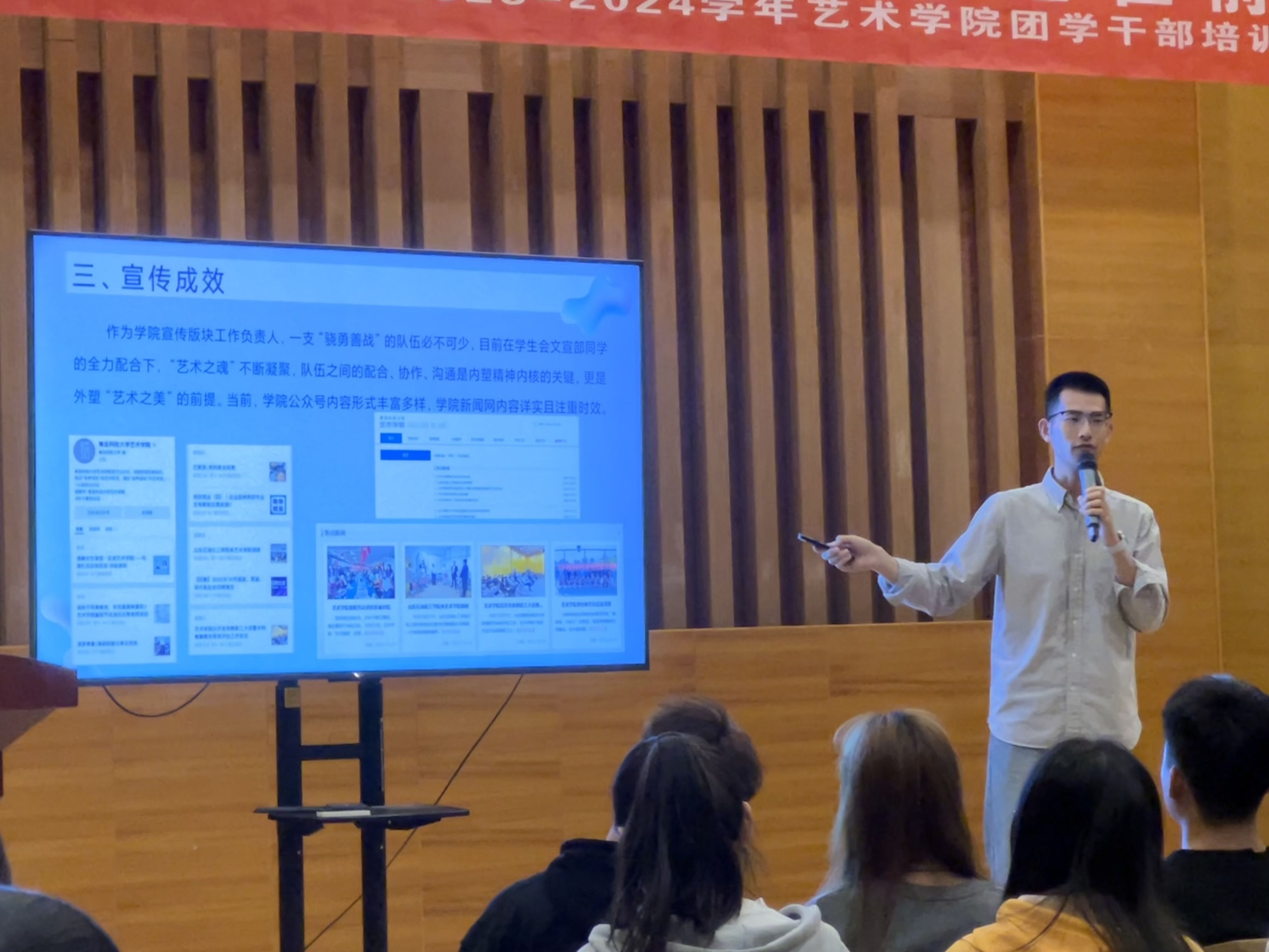杨橙以“宣传工作如何内塑艺术之魂,外塑艺术之美”为主题,介绍了学院新闻网、公众号等从构思、准备、参与、撰写、发布的全过程,号召全体学团干部积极构思、努力参与学院的宣传工作。