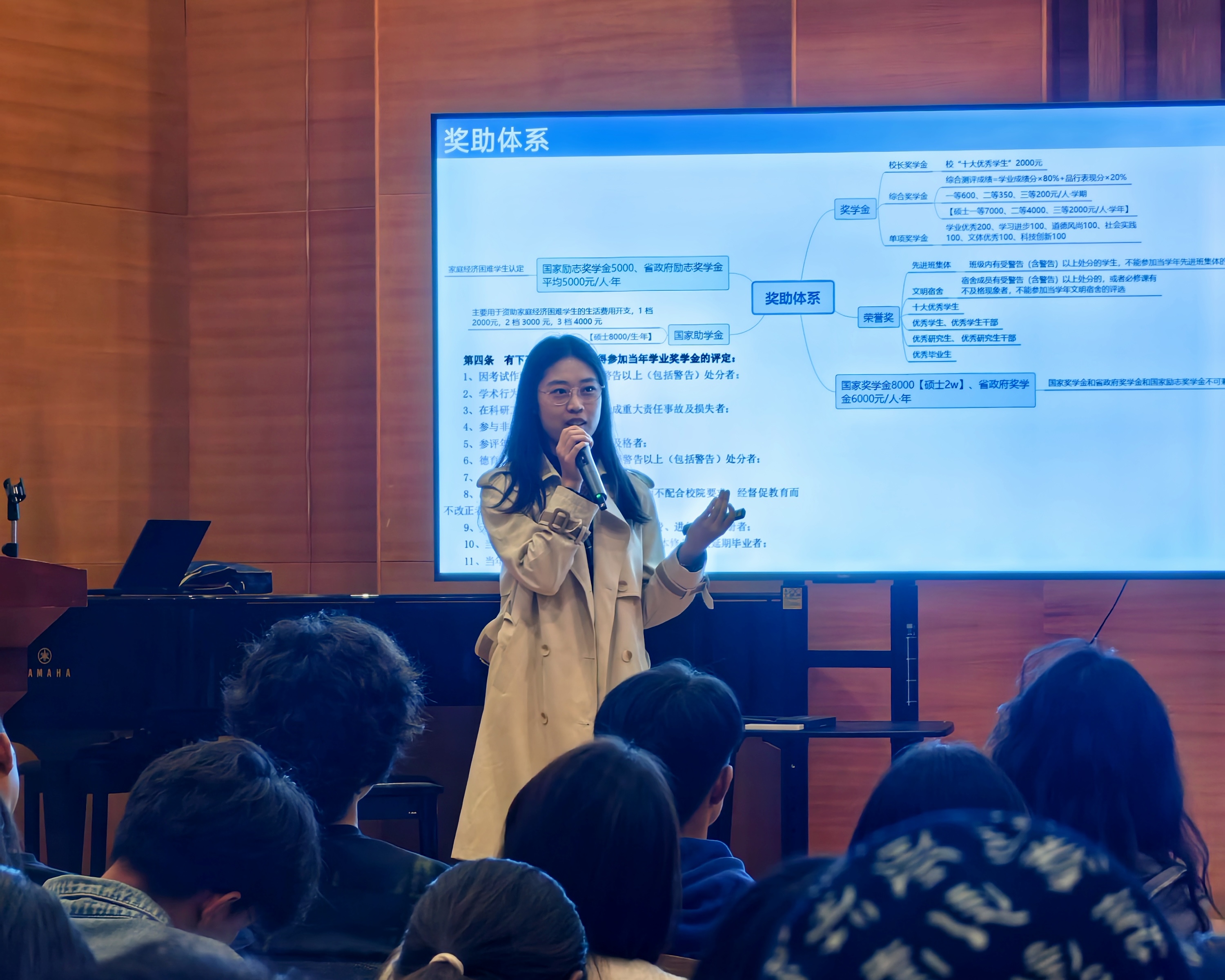 聂楠竹以“助人·筑梦—资助政策与评奖评优”为主题,讲解了获得奖学金和荣誉奖的条件以及评分细则以及资助或贷款项目、对象、标准以及流程,鼓励全体学生干部学习、工作同步发展。