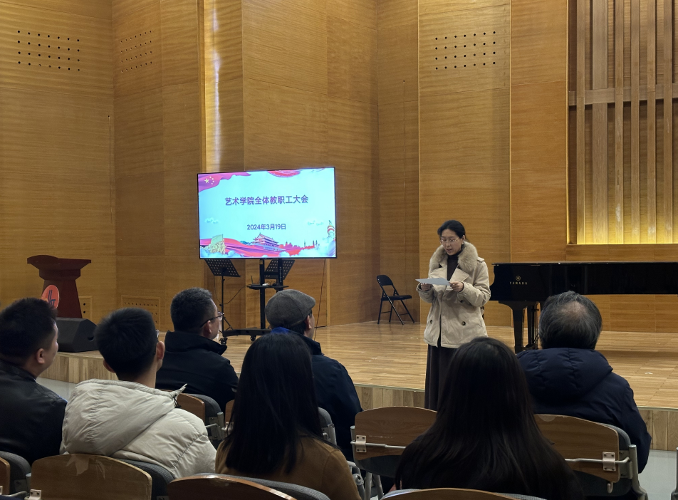 3月19日下午,beat365在线唯一官网全院教职工大会在学校美育中心音乐厅召开,学校党委组织部副处级组织员齐青出席会议,学院党政领导和全体教职工参加会议。会议由学院党委书记刘庆主持。