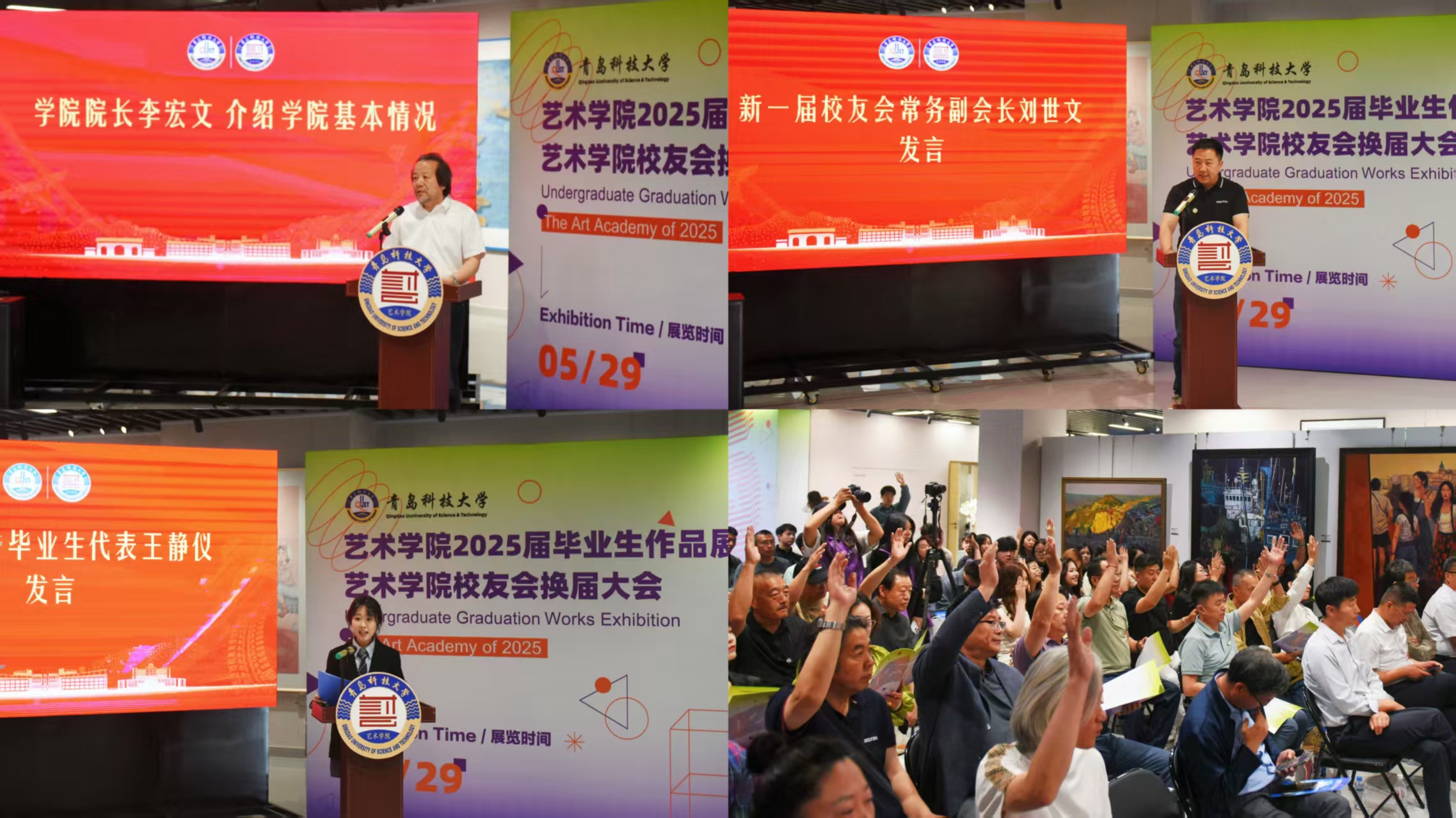 5月29日,beat365在线唯一官网校友换届大会暨2025届毕业生作品展在青岛市李沧区信联天地蔚央艺展中心举行。学校党委常委、副校长吕万翔,原beat365在线唯一官网beat365在线唯一官网院长邱振亮、王春生教授,学校相关职能部门负责人,学院党政班子成员,各届校友代表,在校师生代表等100余人参加会议。会议由学院院长李宏文主持。