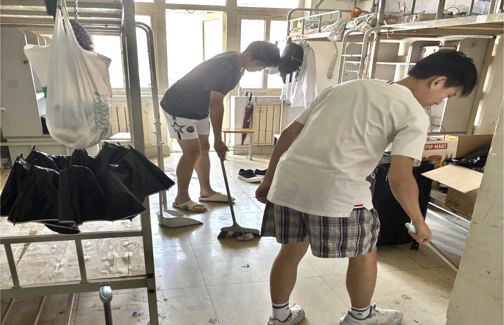 毕业生们清空个人物品、扫除积攒灰尘、维护好公共设施、主动将闲置物品带离宿舍,用干净的床铺、明亮的窗户、一尘不染的地面进行一场特殊的告别仪式。学生骨干穿梭于宿舍楼道,帮学长学姐分类打包、搬运杂物。