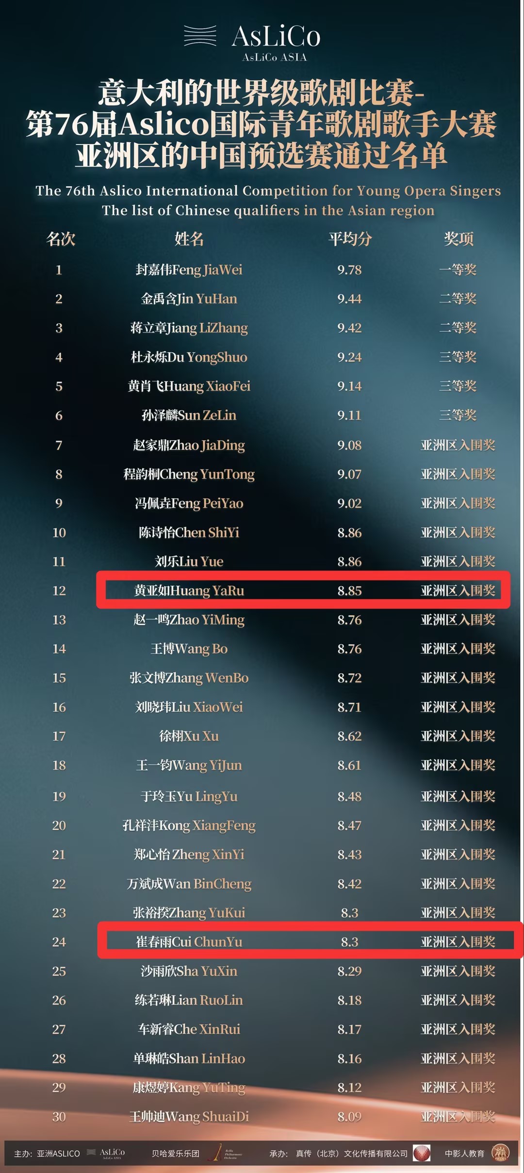 据悉,AsLiCo阿斯利科国际歌剧声乐比赛(International AsLiCo Competition for Young Opera Singer)是由意大利歌剧及演唱会协会(Associazione Lirica e Concertistica)自1949年成立主办的比赛,被意大利国家文化遗产部批准,被认定为欧洲最重要的年轻声乐家比赛之一。