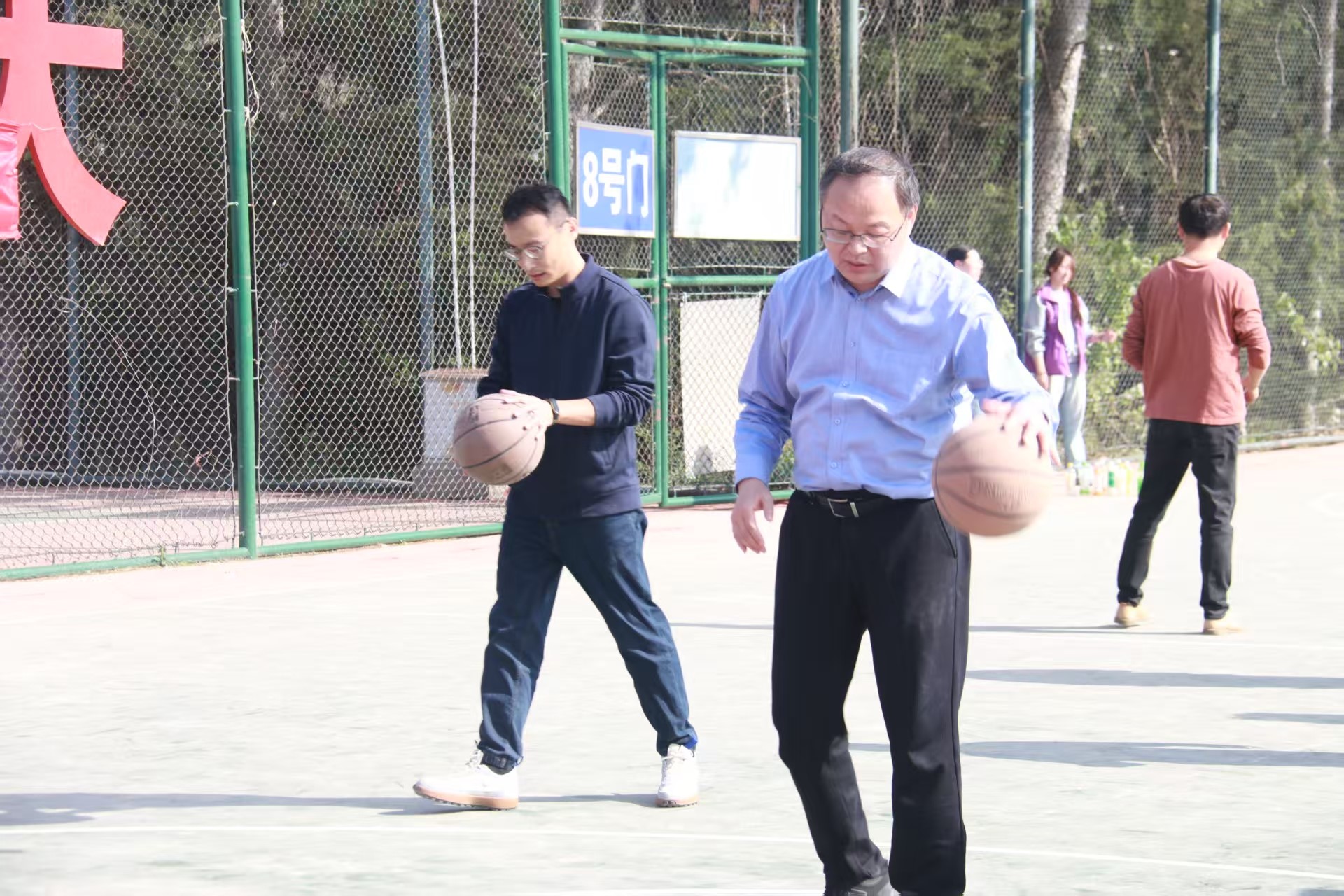 运动会设置趣味跑、跳绳、投篮、10米地滚球四个项目,比赛现场,加油声、欢笑声此起彼伏。趣味跑时,老师们步伐轻快,全力冲刺;跳绳项目中,大家身轻如燕,跳绳飞转;投篮比赛,老师们出手快准狠;10米地滚球区域,老师们全神贯注,巧妙控球,展开策略较量。